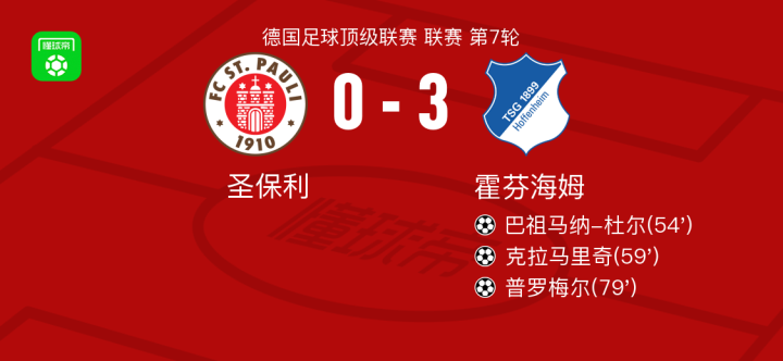 北京时间10月19号德甲第7轮,圣保利主场迎战霍芬海姆。霍芬海姆这边巴祖马纳-杜尔、克拉马里奇、普罗梅尔纷纷建功。最终圣保利0-3惨败霍芬海姆。